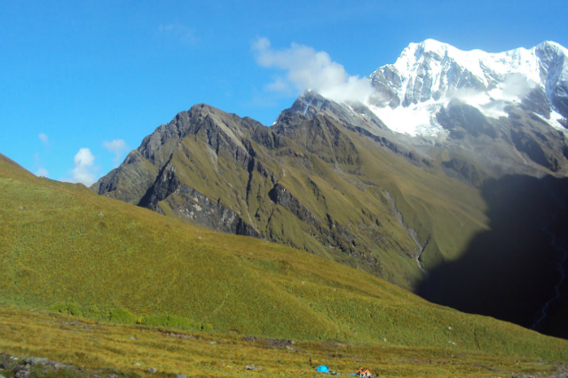 Our morning is delightful today with views of great number of Himalayan peaks like Trishul, Nandaghungti. Chaukhamba, Kedardome and Nilkantha. The sight definitely energizes us all as we prepare to hit the trail. We can see our route through the mountains as we are above tree line now. The trail looks flatish with lots of swings. asily we reach Ghora Lotani.